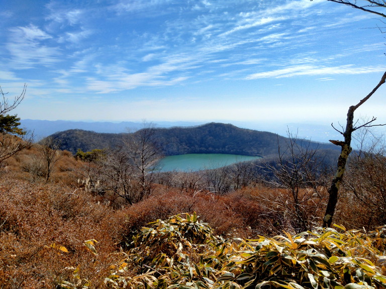 エメラルドグリーンの小沼が見えました。あの尾根が長七郎山と小地蔵岳かな。